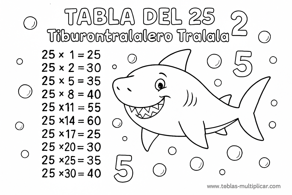 Descarga gratis la tabla del 25 lista para imprimir con Tiburontralalero Tralala, solo en www.tablas-multiplicar.com, y convierte el aprendizaje de la multiplicación en una experiencia divertida y memorable.